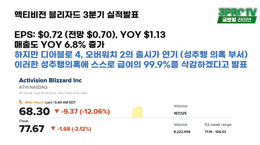 지난 11월2일 3분기 실적 발표 후 액티비전 블리자드는 엄청난 하락을 보여주었습니다. 그 이유는 Earing miss 보다는 디아블로4, 오버워치2의 무기한 출시 연기 소식 때문이었습니다.