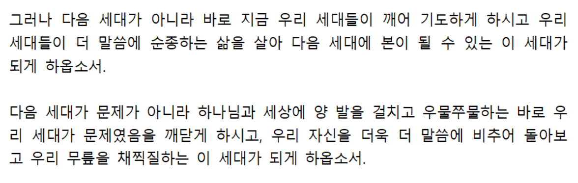 그러나 다음 세대가 아니라 바로 지금 우리 세대들이 깨어 기도하게 하시고 우리 세대들이 더 말씀에 순종하는 삶을 살아 다음 세대에 본이 될 수 있는 이 세대가 되게 하옵소서.